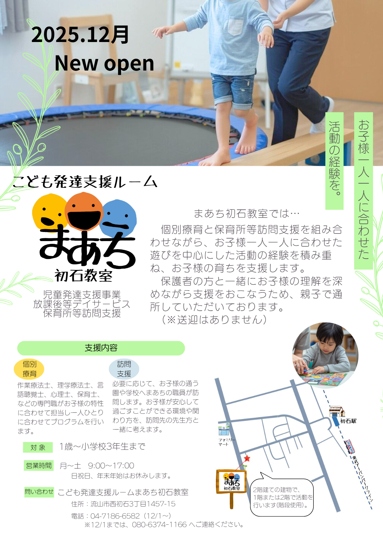 こども発達支援ルームまあち初石教室 開設のお知らせ 2025/11/19 令和7年11月19日 関係者の皆様 株式会社アクト・デザイン 代表取締役 嘉門 邦岳 千葉県柏市大室1-24-1 こども発達支援ルームまあち 初石教室開設のお知らせ 拝啓 平素より格別のご厚情を賜り、心より御礼申し上げます。 さて、このたび、地域における支援ニーズの高まりを受け、「こども発達支援ルーム初石教室」を開設する運びとなりました。 今後も、専門職による質の高い支援と関係機関との連携を大切にしながら、お子さまの自立と社会参加を支えられるよう努めてまいります。 今後とも、地域の発達支援体制の充実に向けて、変わらぬご指導とご高配を賜りますようお願い申し上げます。 敬具
